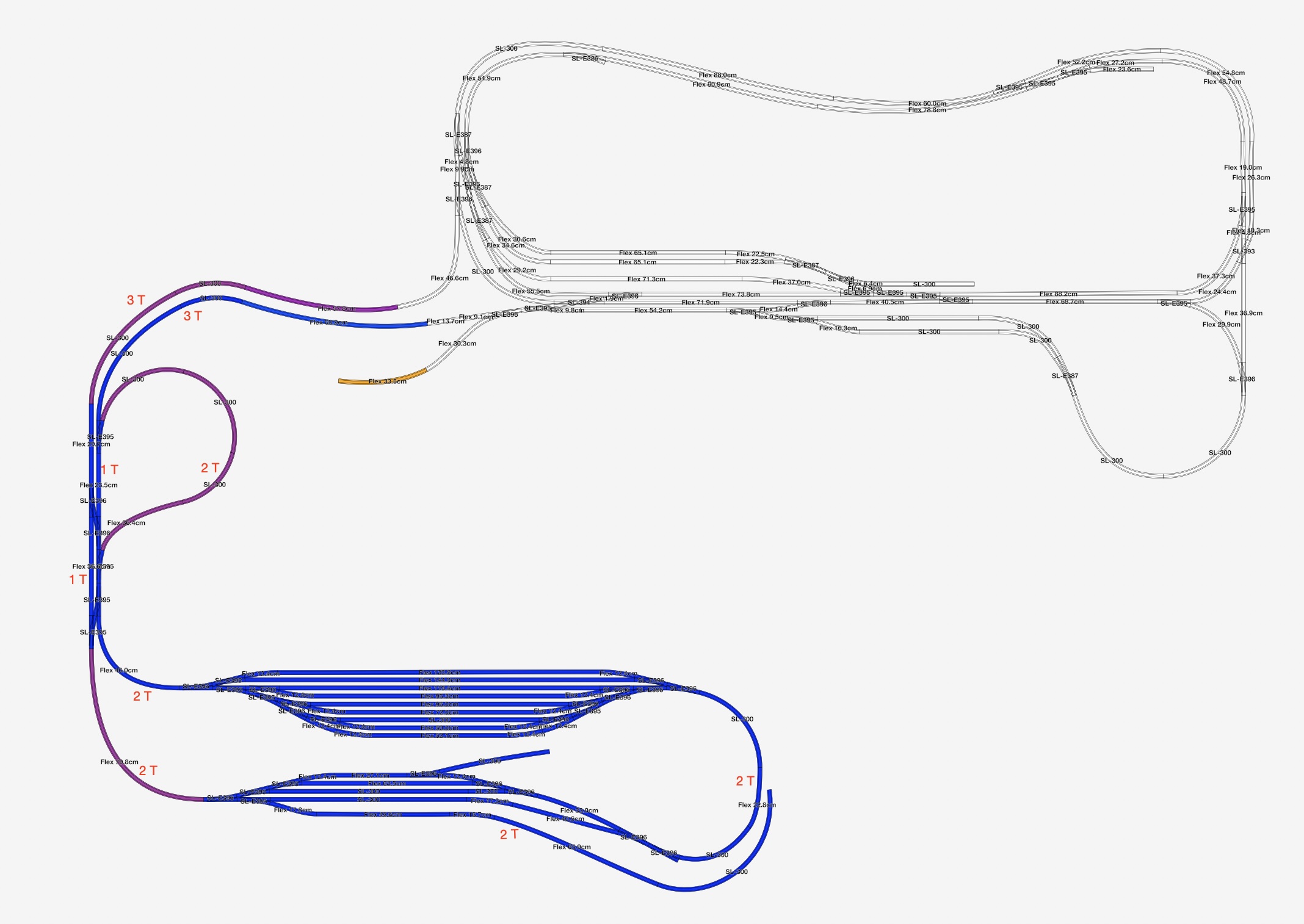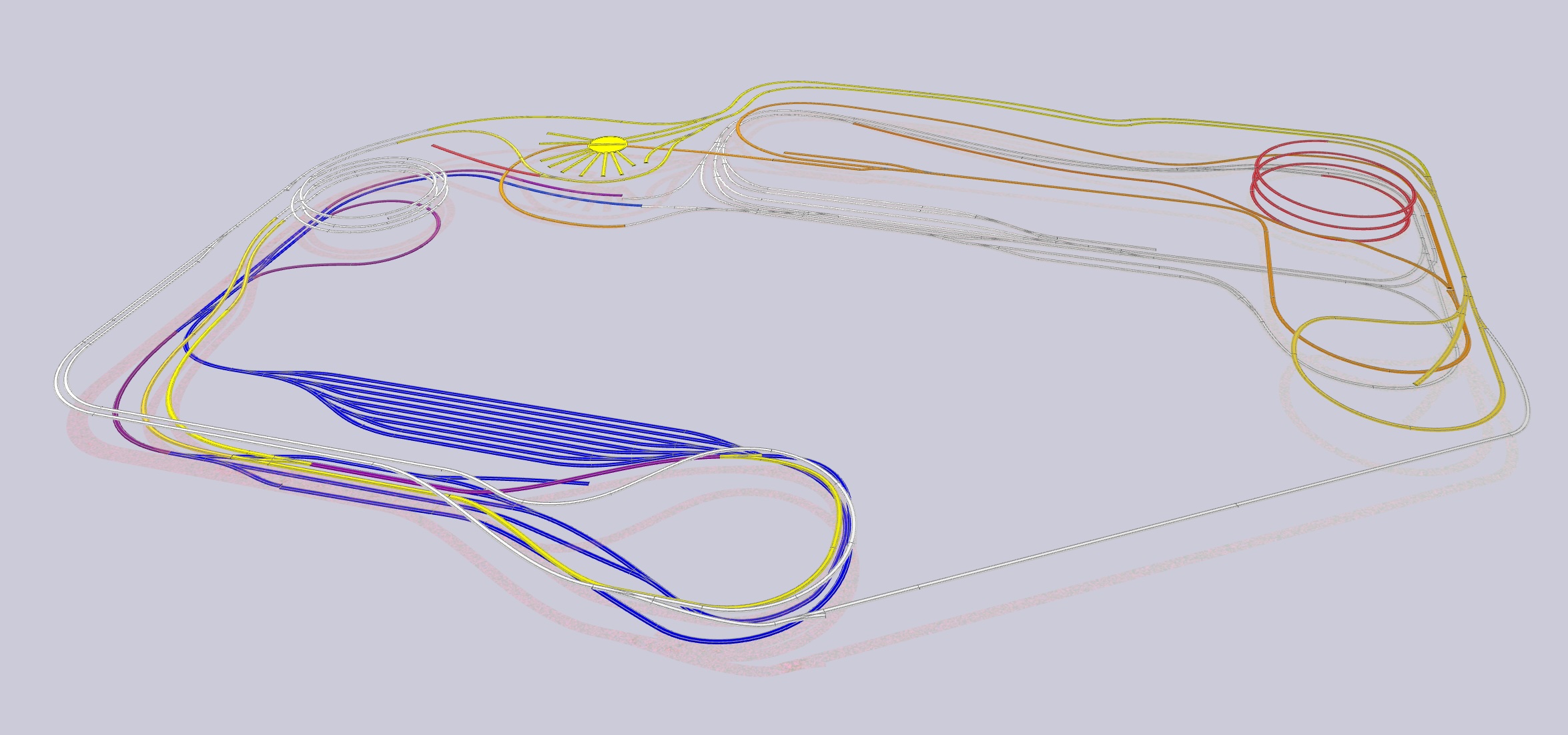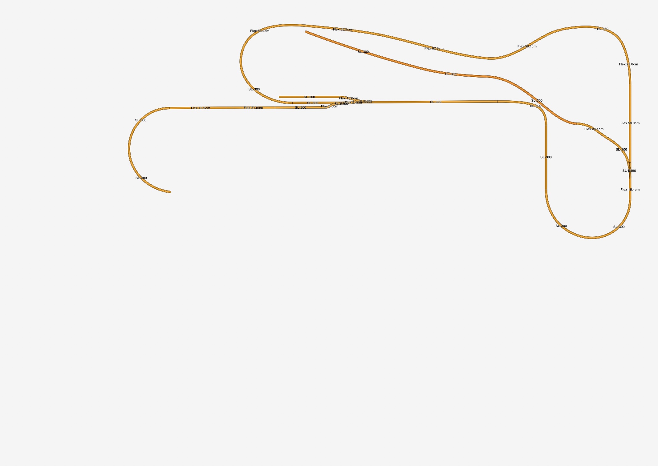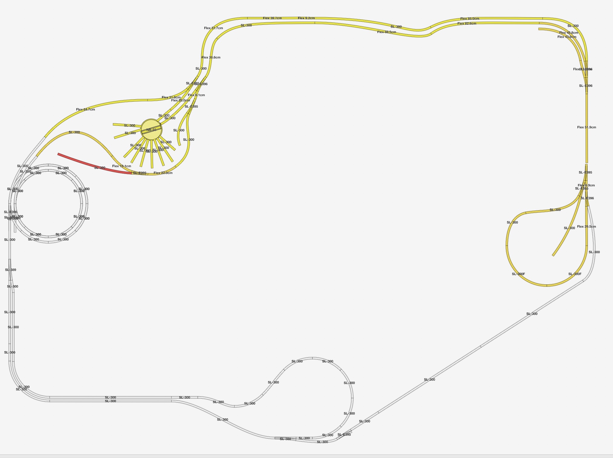 De sporen zijn aangelegd met PECO flextrack. De baan telt 74 wissels (PECO electrofrog) en 2 kruisingen (insulfrog).
